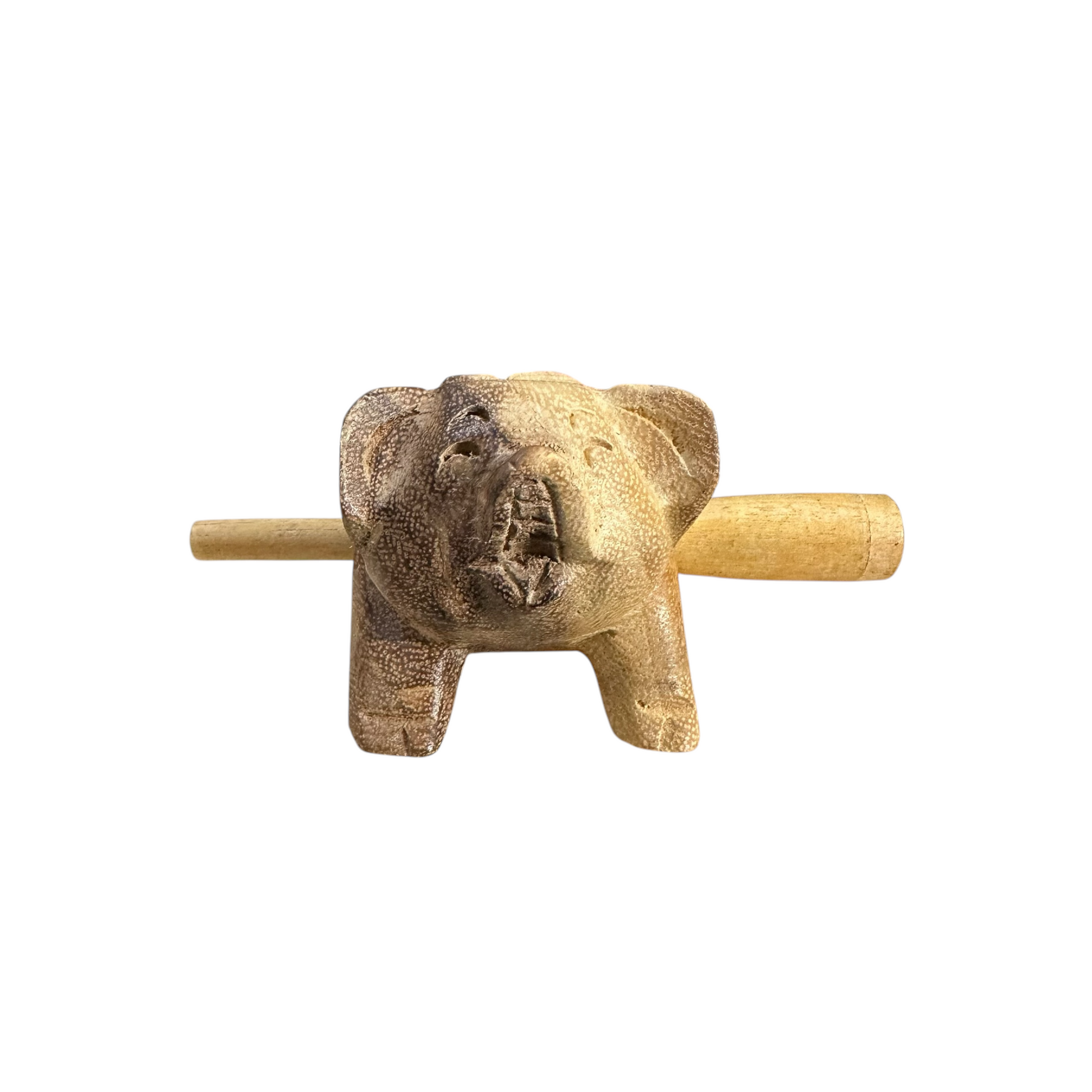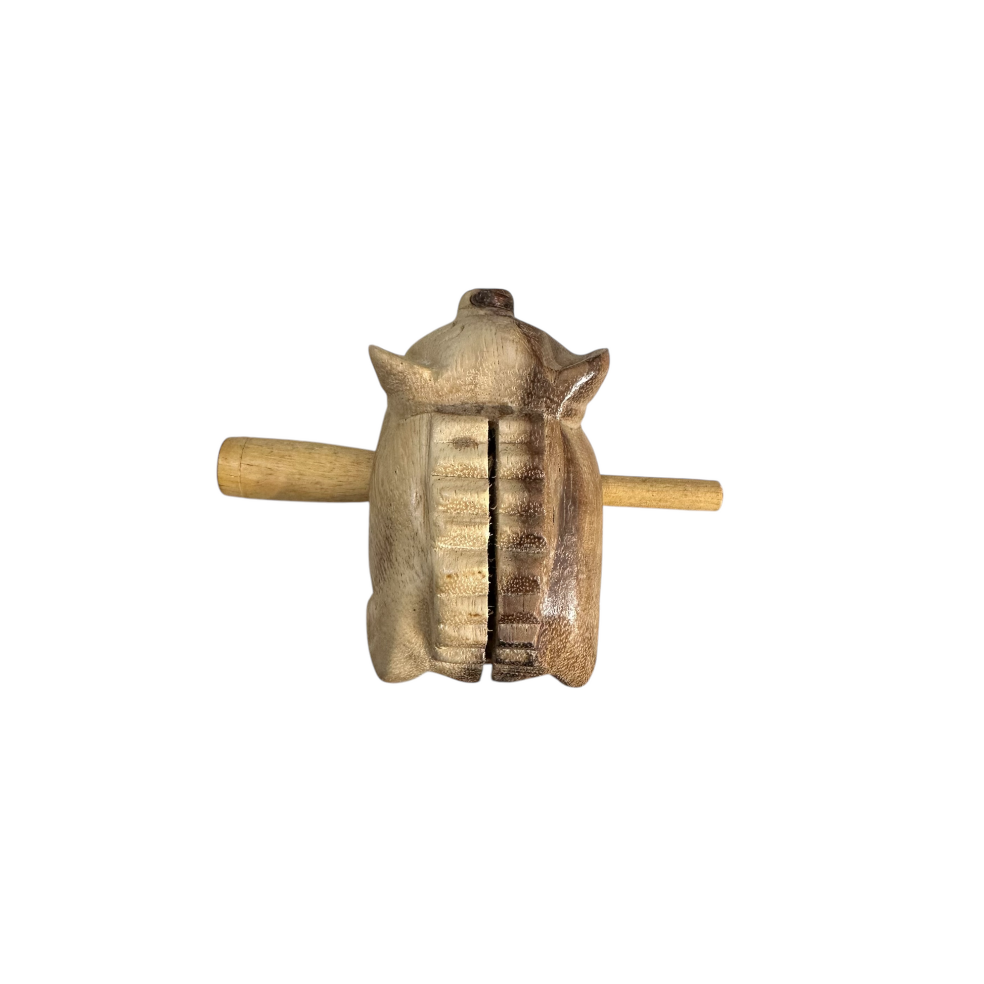 Playing this wooden pig is more fun than a roll in the mud! Adorably designed, this precious pig is constructed completely by hand in Thailand. It is meticulously shaped, smoothed, and smothered with superior detail work that gives the pig a curled tail and pudgy, playful rolls that allow this musical toy to look life like. Make some marvelous music by tapping the piggy on its side, head, or rear; or slide the wooden mallet down the grooves on its wooden back. When you are finished making music, place the mallet in its mouth to ensure it does not get lost. It fits perfectly! If you have a pig lover in your life who loves to collect cool and interesting pig figurines, or if you have a young child who shows interest in music or animals, they will love to get their hands on this light-stained, wooden hog!