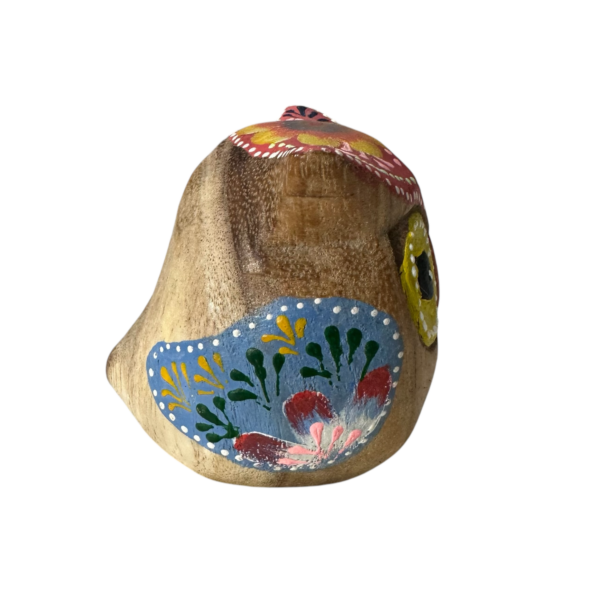 Beautiful hand-carved wooden owl with bright blue and yellow floral details. Perfect for rustic home décor or as a thoughtful gift.
