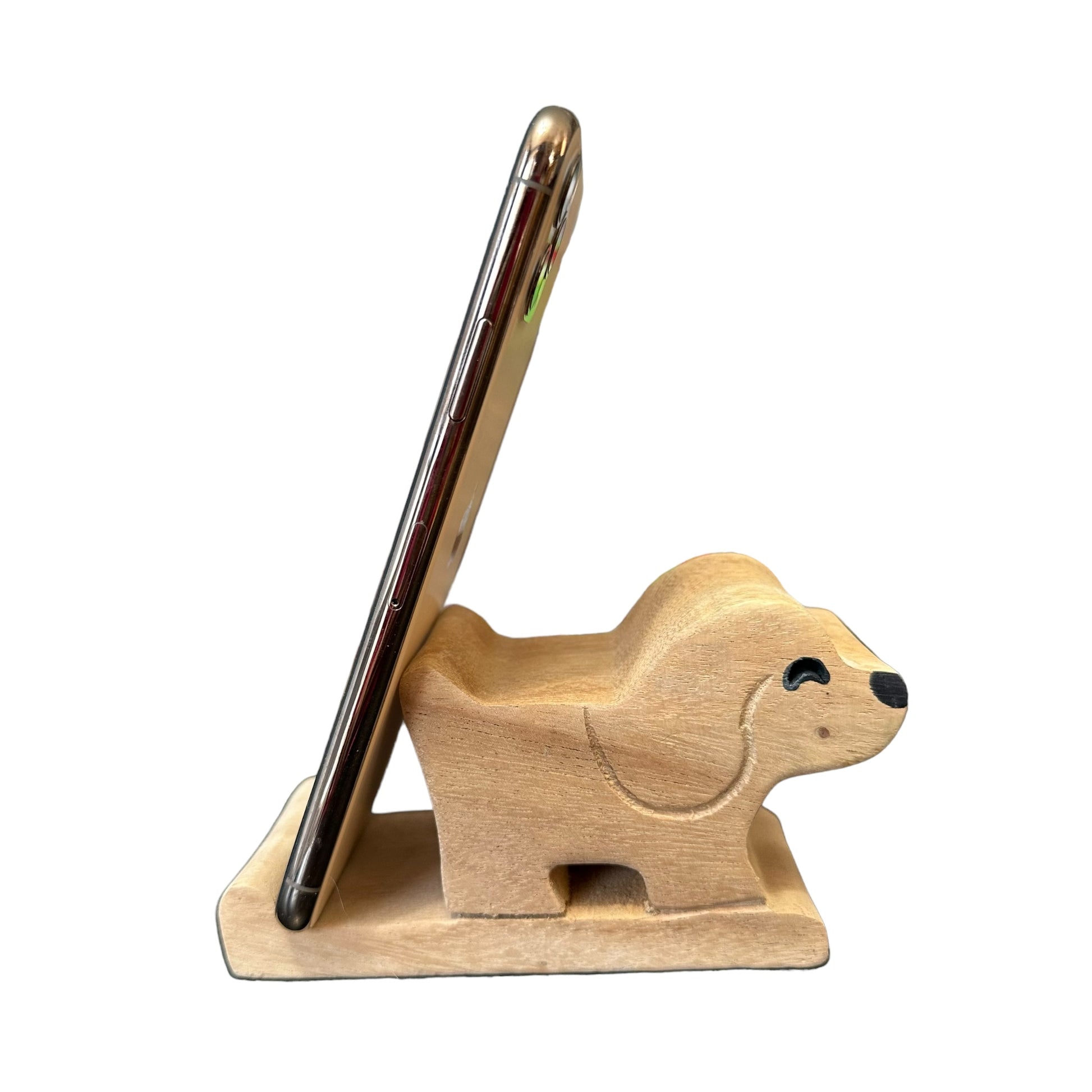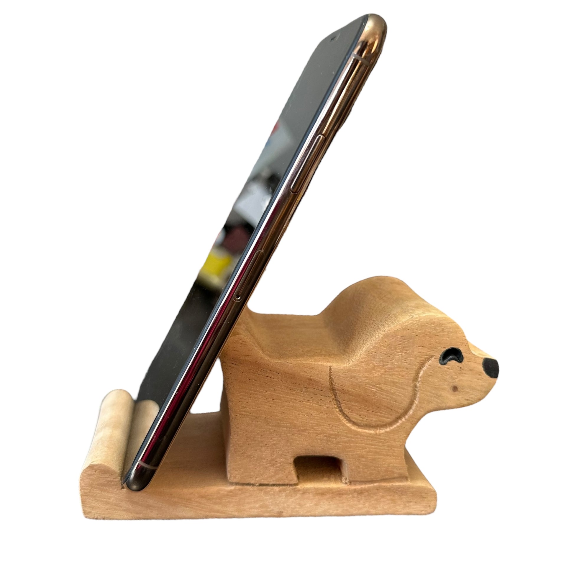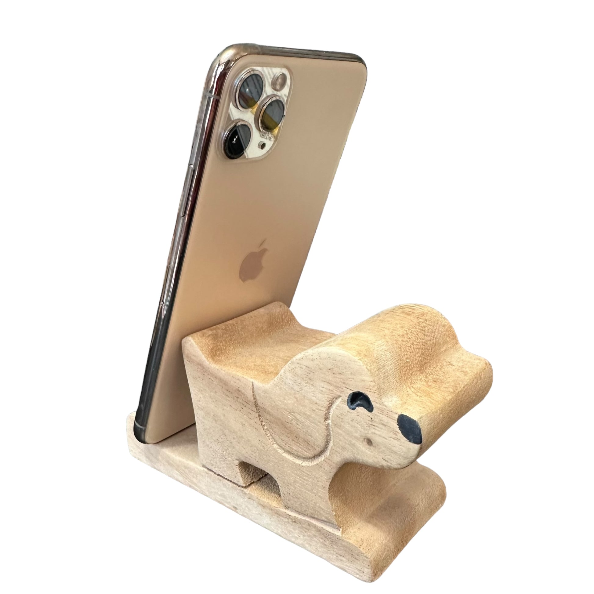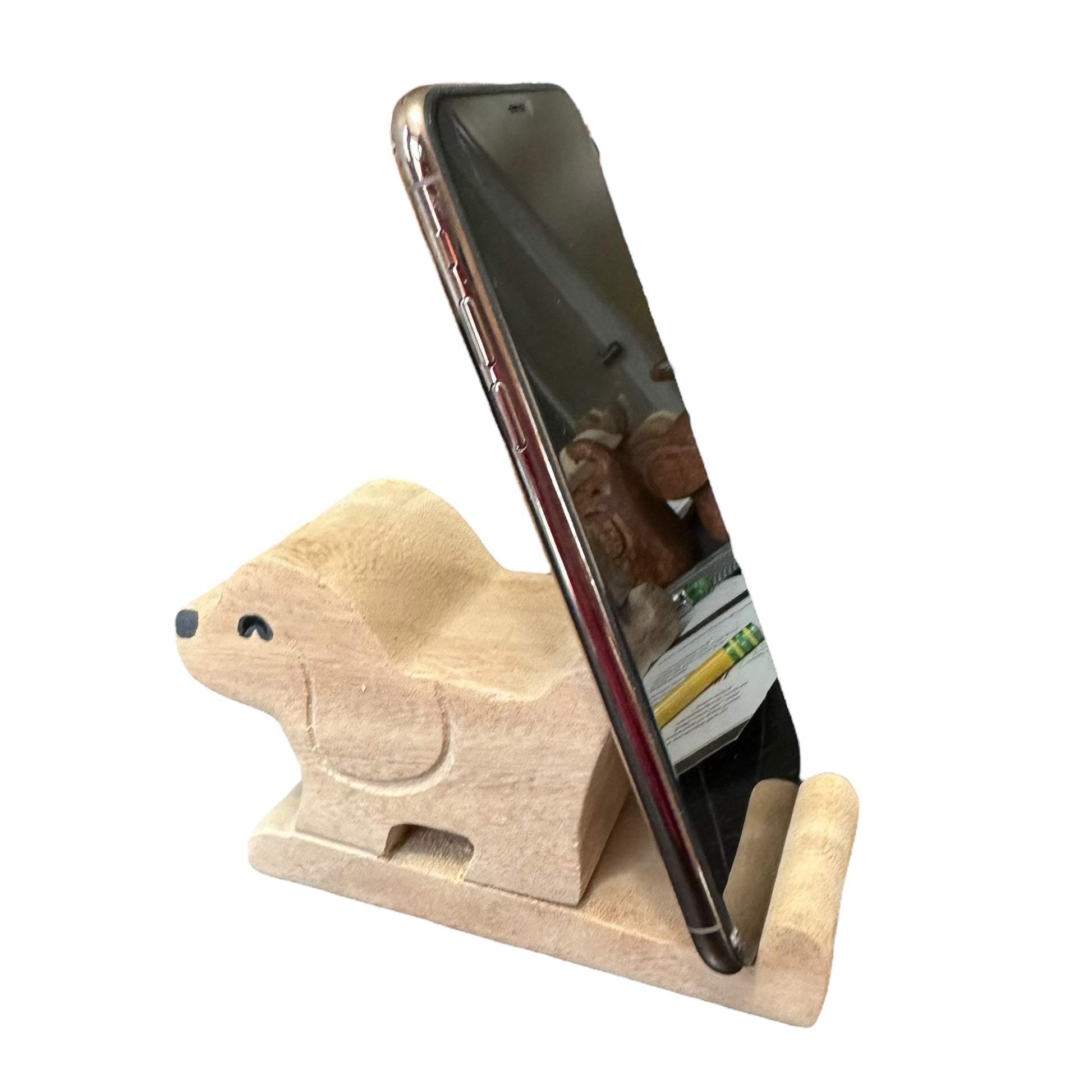 a delightful blend of functionality and charm. Crafted from natural wood, this adorable stand securely holds your phone in portrait or landscape mode. Perfect for dog lovers or as a unique gift, it adds a touch of whimsy to any desk or nightstand.