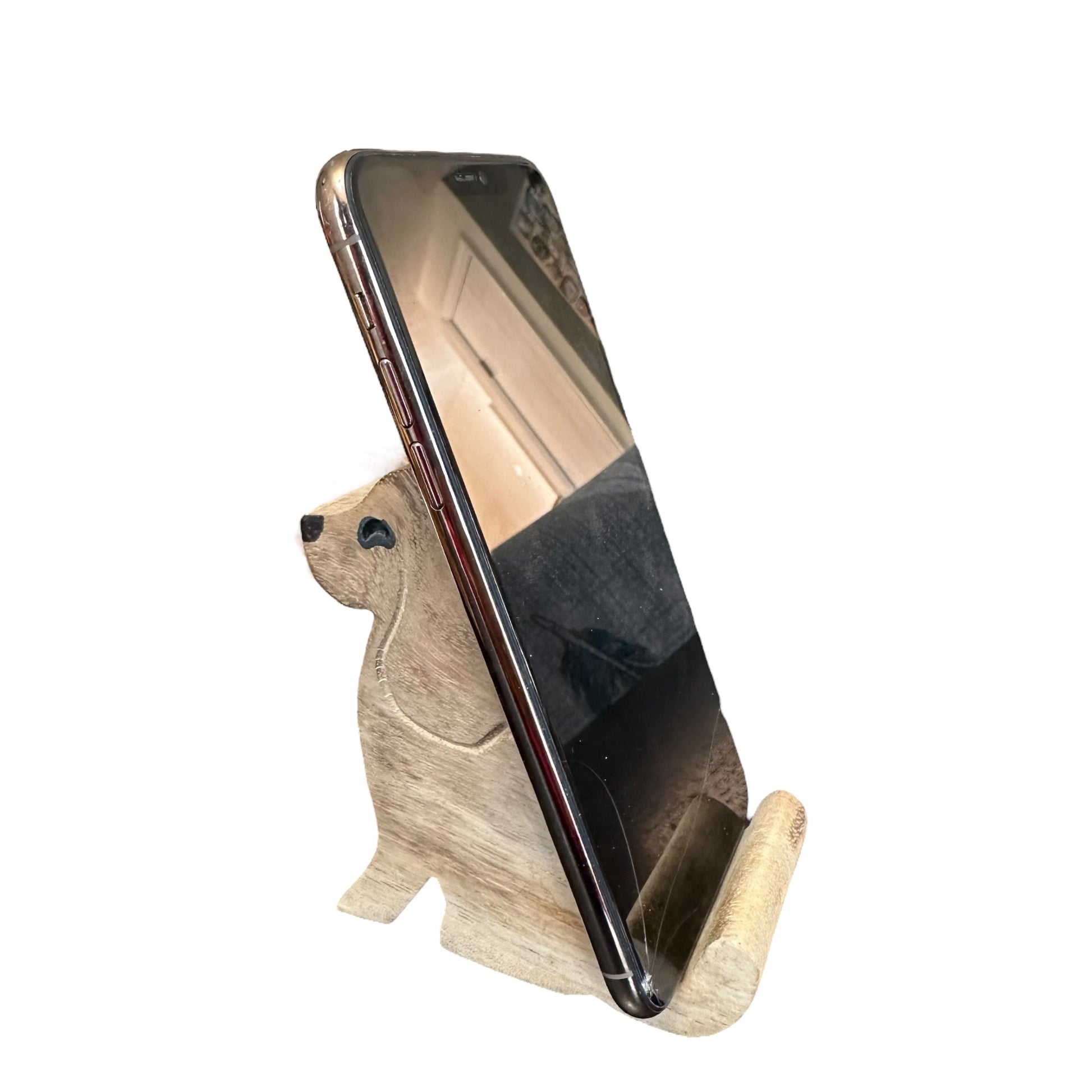 a delightful blend of functionality and charm. Crafted from natural wood, this adorable stand securely holds your phone in portrait or landscape mode. Perfect for dog lovers or as a unique gift, it adds a touch of whimsy to any desk or nightstand.