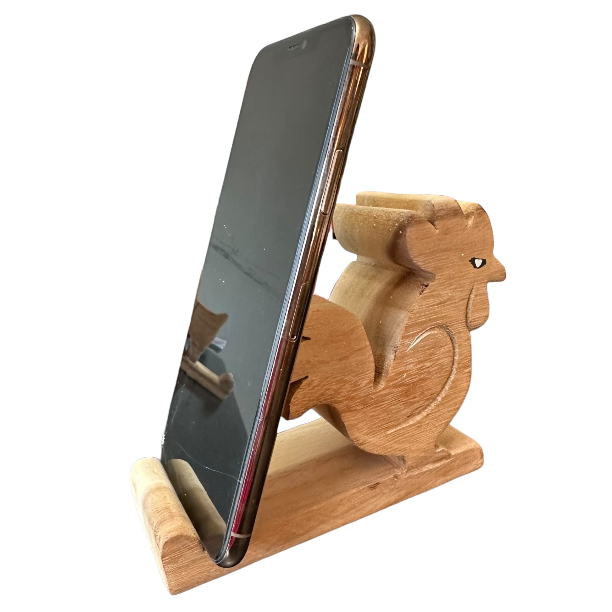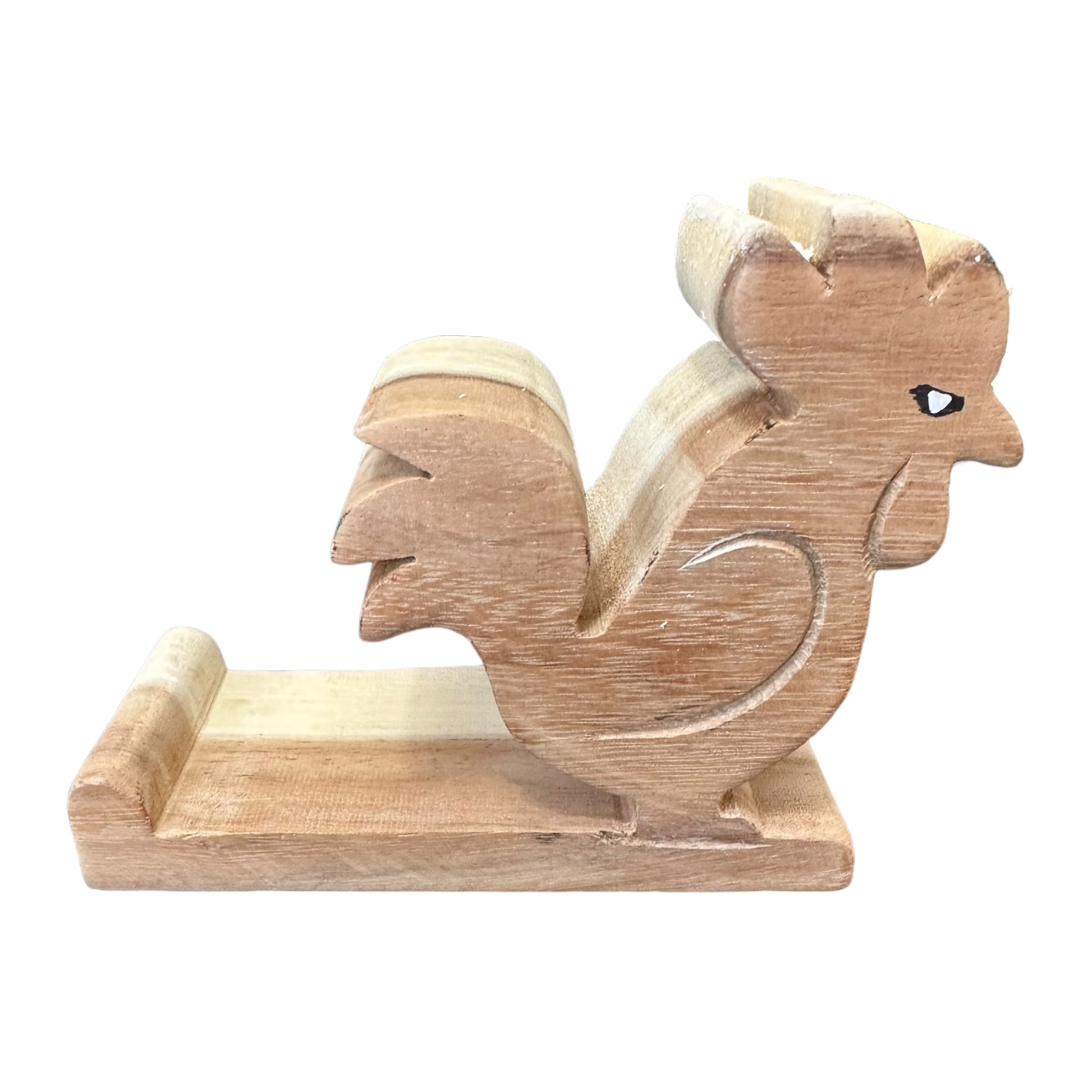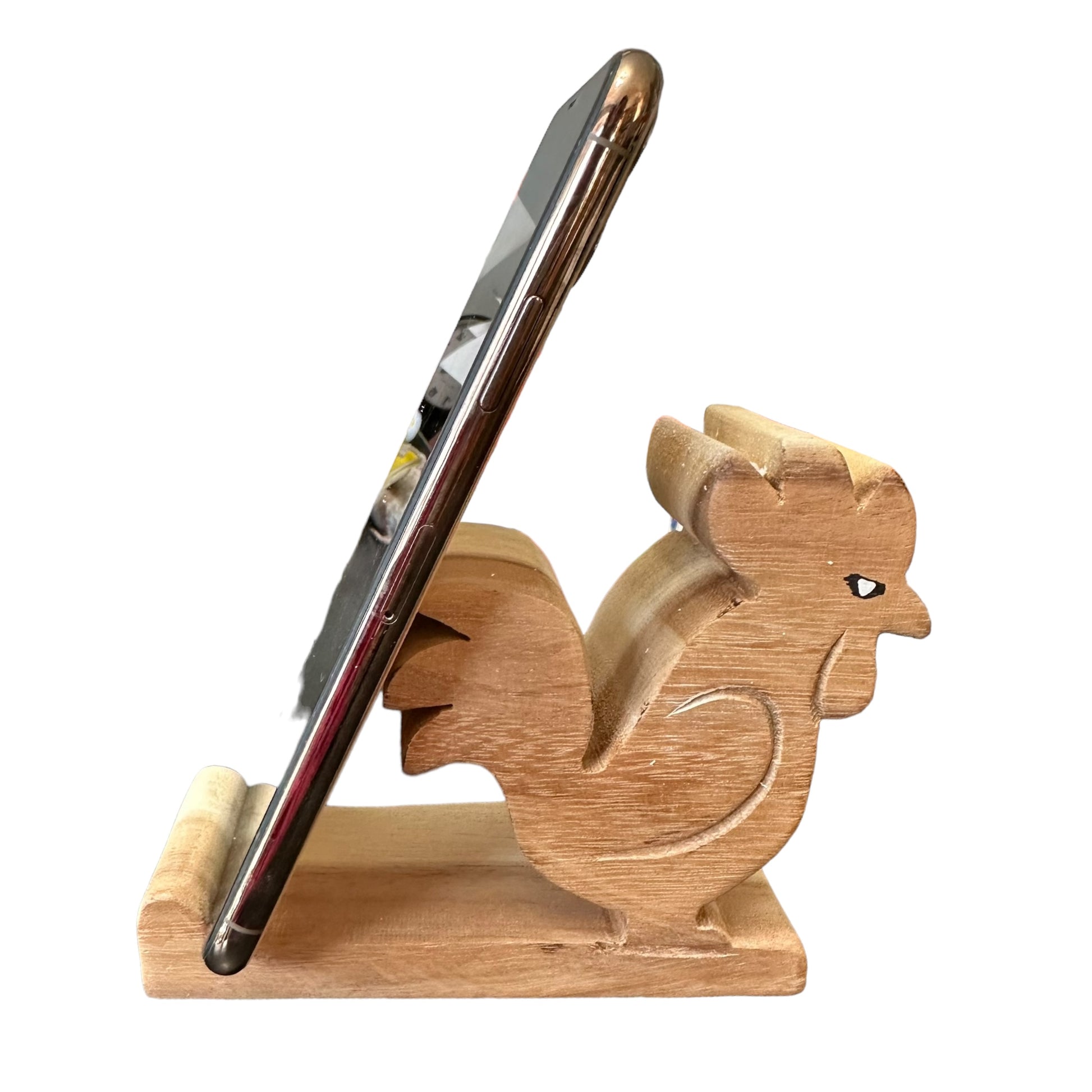 a delightful blend of functionality and charm. Crafted from natural wood, this adorable stand securely holds your phone in portrait or landscape mode. Perfect for rooster lovers or as a unique gift, it adds a touch of whimsy to any desk or nightstand.